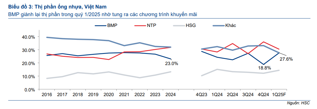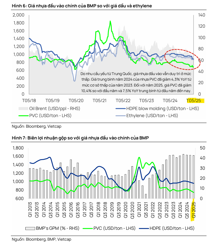 - Giá nguyên liệu đầu vào thuận lợi: Nhu cầu đối với vật liệu xây dựng tại Trung Quốc vẫn yếu do ngành BĐS tư nhân suy yếu, giữ cho giá hạt nhựa PVC đầu vào ở mức thấp. Điều này trực tiếp hỗ trợ biên lợi nhuận của BMP.