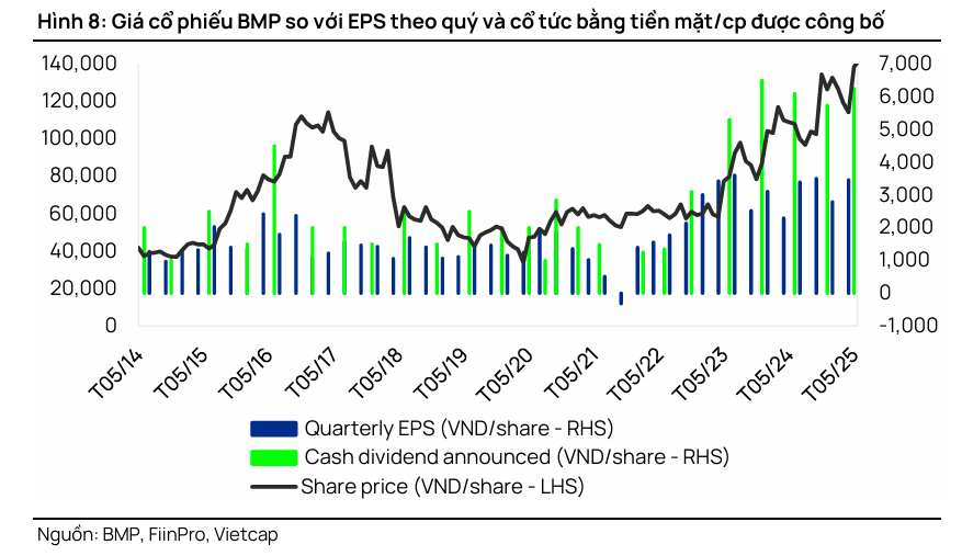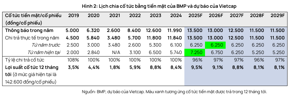 BMP nổi bật với chính sách chi trả cổ tức tiền mặt cao và ổn định. Với tỷ lệ thanh toán cổ tức luôn ở mức 100% trong giai đoạn 2019-2024, Vietcap kỳ vọng BMP sẽ chia cổ tức năm tài chính 2025 ở mức 13,500 đồng/cổ phiếu, tương ứng với tỷ lệ thanh toán là 96% và lợi suất cổ tức 12 tháng tới là 9.5%.