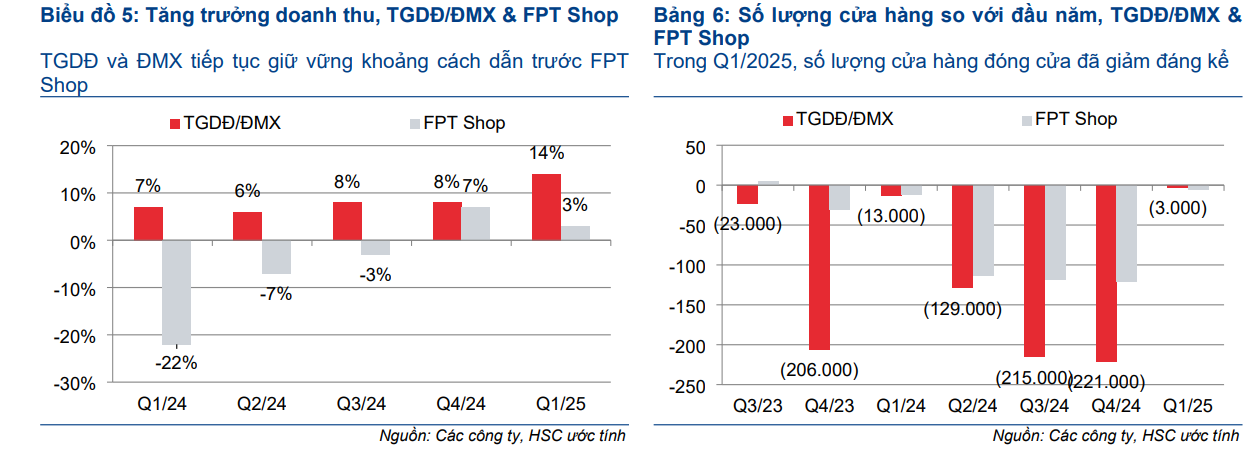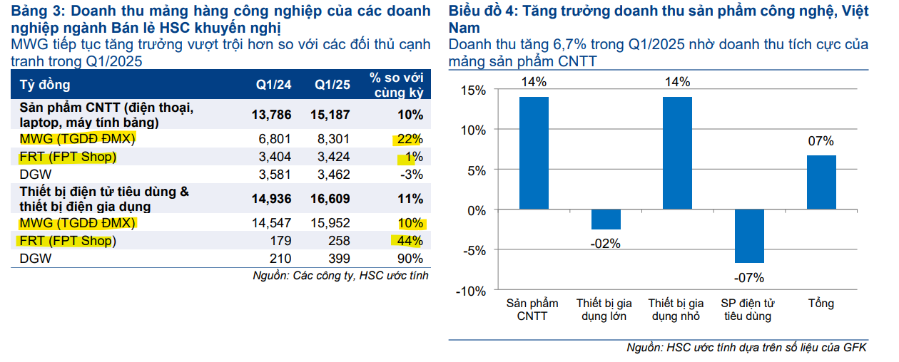 HSC nhận định rằng, mức tăng trưởng 14% doanh thu sản phẩm CNTT của toàn ngành chủ yếu nhờ doanh thu sản phẩm CNTT của MWG tăng 20%, do MWG chiếm tới 55-60% thị phần của ngành. Điều này cho thấy các công ty khác trong ngành công nghệ tiêu dùng đã bị sụt giảm doanh thu trong Quý 1/2025. Hoạt động tái cấu trúc tại chuỗi TGDĐ/ĐMX cũng gần như hoàn tất, chỉ có 3 cửa hàng bị đóng cửa trong Quý 1/2025, so với quy mô lớn trong năm 2024.