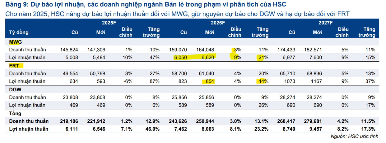 HSC đã tăng bình quân 8% dự báo tổng lợi nhuận ròng giai đoạn 2025-2027 cho các công ty bán lẻ, trong đó dự báo lợi nhuận thuần của MWG được tăng 9% cho năm 2025 và điều chỉnh tăng cho các năm 2026-2027.