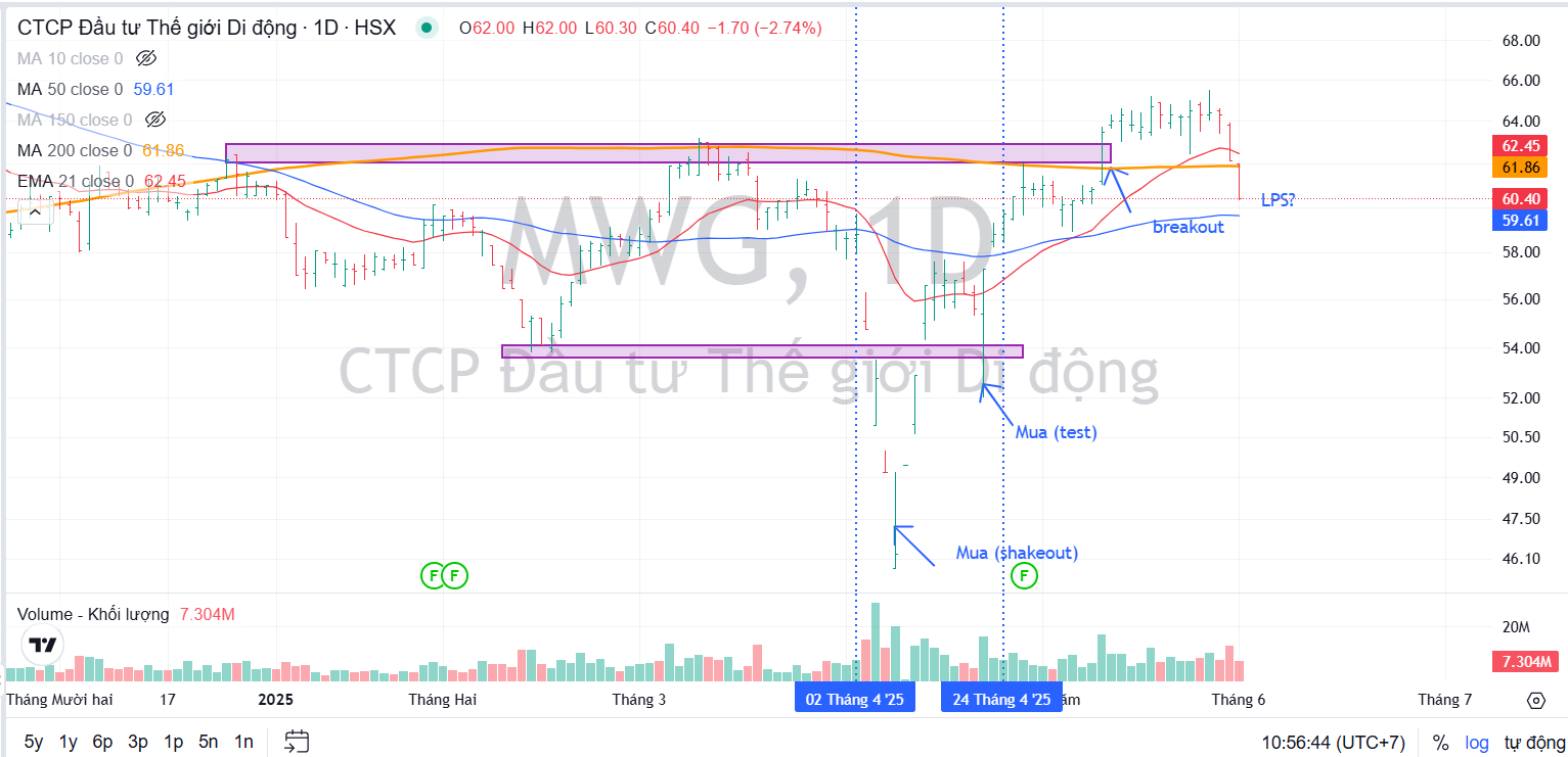 Trên đồ thị, MWG có RS =81, nằm trong số các cổ phiếu hoạt động tốt trên thị trường. Hiện tại MWG đang bị điều chỉnh về dưới EMA 21 ngày sau khi breakout nền giá. Elibook Team cho rằng, hỗ trợ cho MWG là quanh MA50 ngày.