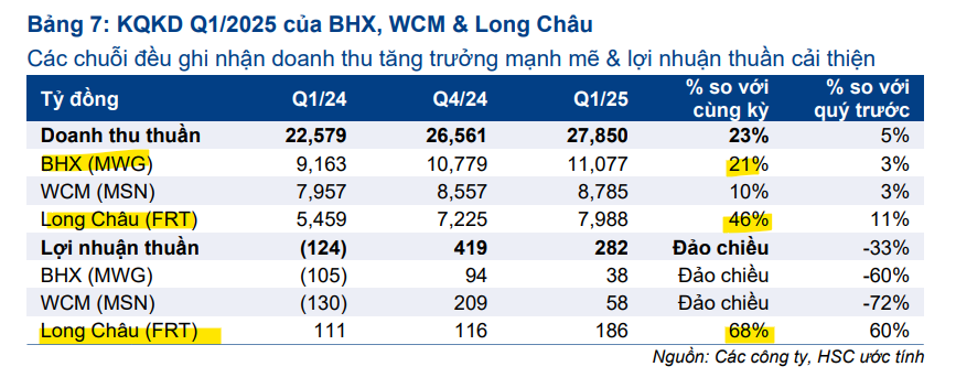 Trong Quý 1/2025, MWG cùng các công ty bán lẻ khác trong danh sách khuyến nghị của HSC đã ghi nhận kết quả kinh doanh tích cực. Tổng doanh thu thuần tăng 17% yoy, cao hơn đáng kể so với đà tăng trưởng doanh thu của toàn ngành bán lẻ Việt Nam (9.9%) và doanh thu bán lẻ hàng hóa (8.8%). Sự tăng trưởng này chủ yếu nhờ vào việc giành thêm thị phần và mở rộng hệ thống cửa hàng.