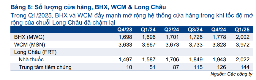 Mảng bán lẻ phi công nghệ của MWG cũng cho thấy sự tích cực. Doanh thu thuần của Bách Hóa Xanh (BHX) tăng mạnh 21% yoy trong Quý 1/2025, nhờ sự cải thiện doanh thu trên mỗi cửa hàng và mở thêm cửa hàng mới. BHX đã bắt đầu có lợi nhuận trong Quý 1/2025, so với thua lỗ trong Quý 1/2024. Tuy nhiên, do tích cực mở thêm cửa hàng mới (224 cửa hàng của BHX), lợi nhuận thuần giảm so với quý trước.
