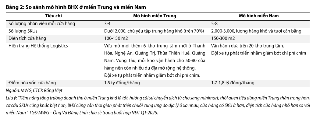 Theo VDSC, mảng BHX của MWG có thể gặp những thách thức trong ngắn hạn do kế hoạch Trung Tiến đang khiến doanh thu/cửa hàng sụt giảm. Mô hình BHX miền trung và miền nam có sự khác biệt nhau và cần thêm thời gian để có hiệu quả.