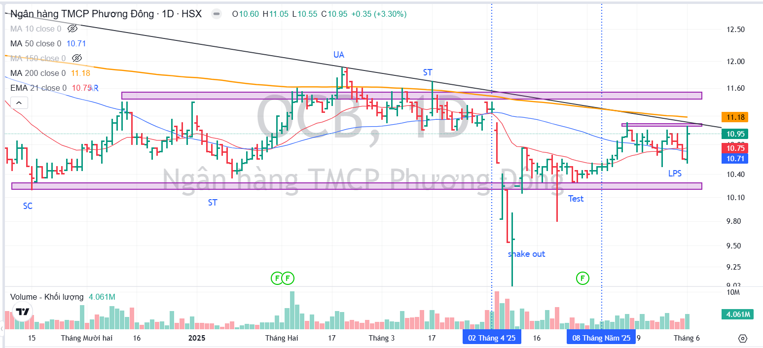 Cổ phiếu OCB đang bị cản bởi đường kháng cự dài hạn, do đó sự tăng giá hiện nay có thể phải mất thời gian để hình thành LPS.