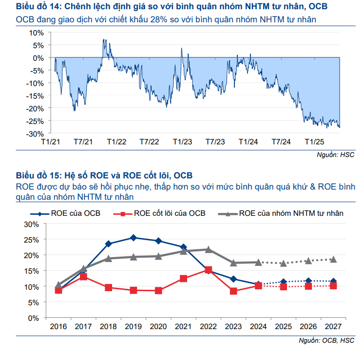 HSC nhận định OCB sẽ cần thêm thời gian để phục hồi hoàn toàn do TTHĐ sụt giảm và rủi ro chất lượng tài sản gia tăng, kéo theo gánh nặng chi phí dự phòng. Hệ số ROE và ROE cốt lõi được dự báo sẽ cải thiện nhẹ nhưng vẫn ở mức thấp, thấp hơn so với mức đỉnh trong quá khứ và so với bình quân nhóm NHTM tư nhân.
