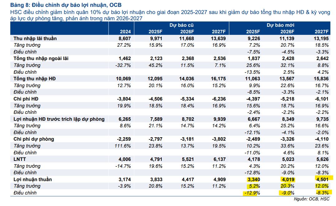 Trước những diễn biến này, HSC đã điều chỉnh giảm bình quân 10% dự báo LNTT của OCB cho giai đoạn 2025-2027. Cụ thể, LNTT dự kiến chỉ tăng trưởng khiêm tốn 4% trong năm 2025, trước khi tăng mạnh hơn lần lượt 20% và 12% trong năm 2026 và 2027. Tính chung 3 năm tới, LNTT dự báo tăng trưởng với tốc độ CAGR đạt 12% (14.9% nếu loại trừ các khoản mục không thường xuyên trong năm 2024).