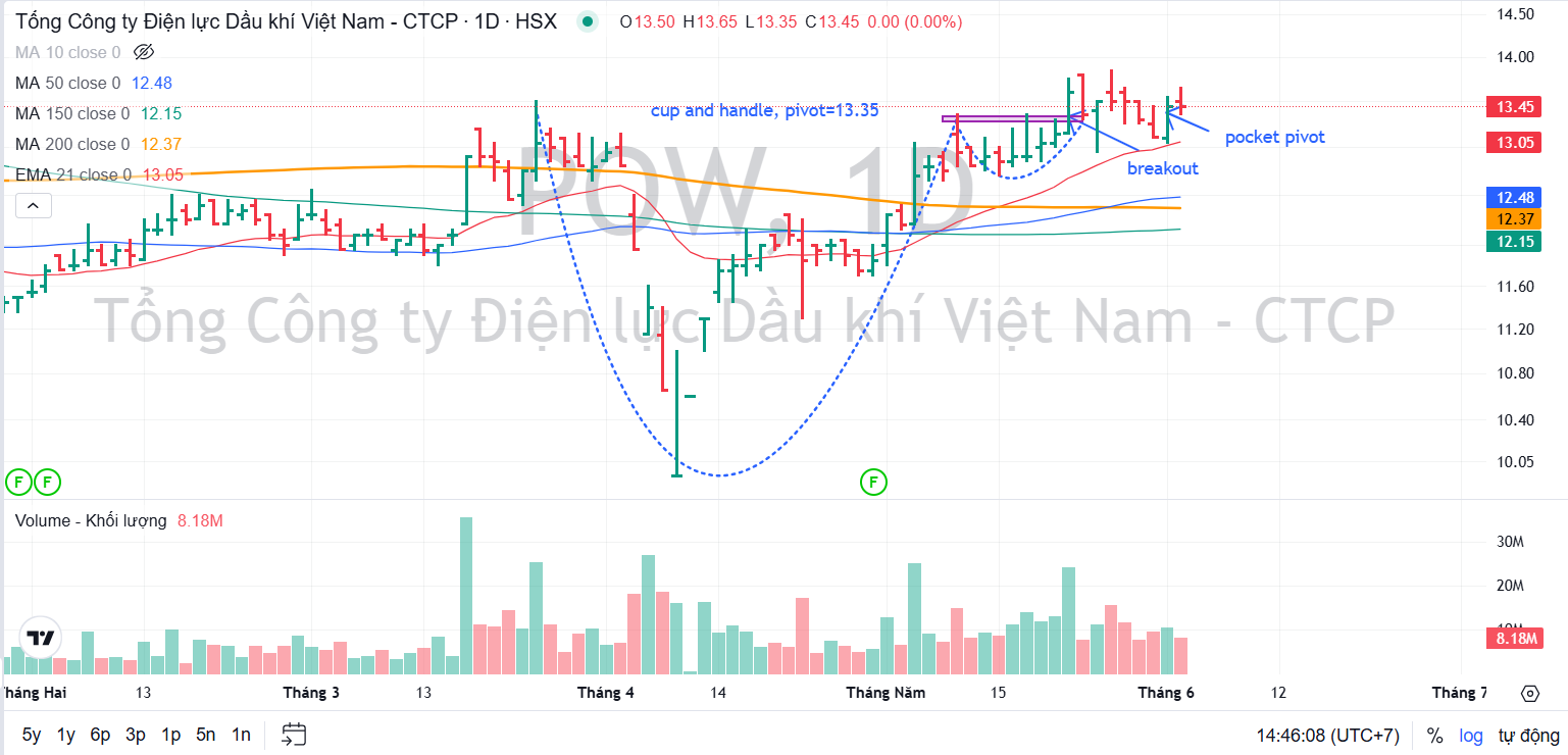 Trên đồ thị, RS của POW là 83, nằm trong số các cổ phiếu hoạt động tốt trên thị trường. Sau khi breakout mẫu hình Chiếc Cốc Tay Cầm vượt qua điểm mua 13,360, POW đang điều chỉnh tìm hỗ trợ quanh EMA 21 ngày khi mà phần lớn các điểm breakout trên thị trường chưa hoạt động tốt.