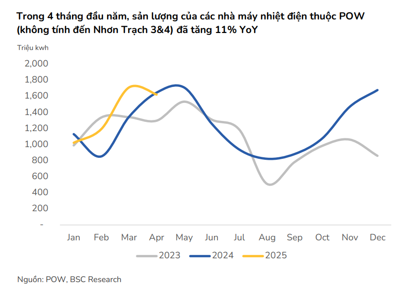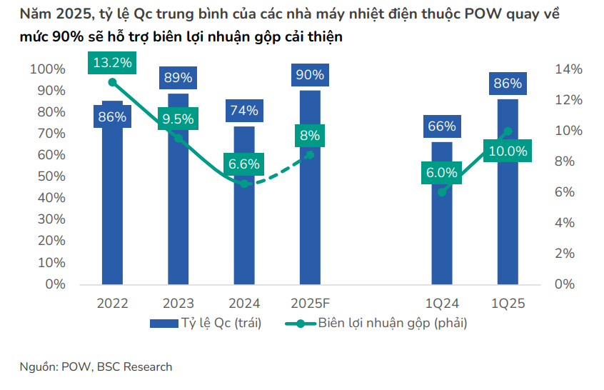 Biên lợi nhuận gộp cải thiện: Bộ Công Thương đã nâng tỷ lệ Qc trung bình của các nhà máy nhiệt điện từ 70% (năm 2024) lên tối thiểu 80% từ năm 2025. Đối với POW, tỷ lệ Qc trung bình dự kiến đạt 90%, cao hơn 16 điểm phần trăm so với năm 2024, giúp các nhà máy bán điện với giá tốt hơn trên thị trường, cải thiện biên lợi nhuận gộp lên 8.0% (từ 6.6% năm 2024).