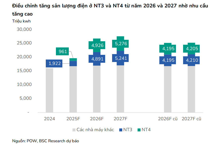 - Nhơn Trạch 3 & 4 đi vào hoạt động: BSC điều chỉnh tăng dự báo tổng sản lượng điện của POW năm 2026 và 2027 lần lượt 6% và 9% so với dự báo cũ. Đặc biệt, sản lượng của Nhơn Trạch 3 và Nhơn Trạch 4 được tăng dự phóng lần lượt 17% và 25%. Dự kiến, nhà máy Nhơn Trạch 3 sẽ phát điện thương mại vào Quý 3/2025, phù hợp với dự báo.