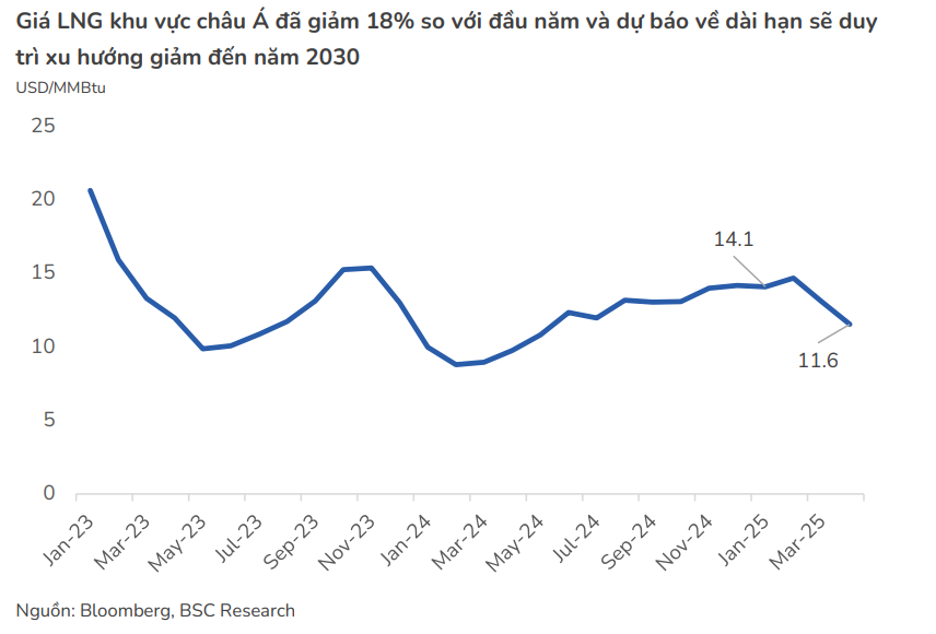 - Chi phí nhiên liệu hạ nhiệt: Giá LNG khu vực châu Á đã giảm 18% so với đầu năm và dự báo tiếp tục xu hướng giảm đến năm 2030. Điều này giúp POW, bao gồm Nhơn Trạch 3 & 4 (sử dụng LNG nhập khẩu), có lợi thế về chi phí, tăng sức cạnh tranh và khả năng được huy động.