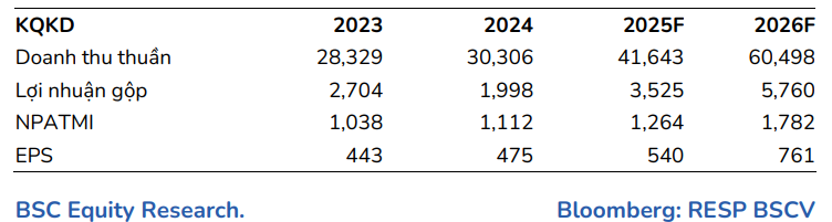 Nhìn về năm 2026, BSC dự phóng LNST-CĐTS đạt 1,602 tỷ VND (+19% so với cùng kỳ), dựa trên doanh thu đạt 59,830 tỷ VND (+45% so với cùng kỳ).