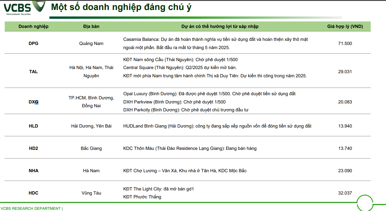 Việc sáp nhập các tỉnh thành đang trở thành một chủ đề nóng, hứa hẹn tạo ra những thay đổi sâu rộng không chỉ về mặt hành chính mà còn tác động mạnh mẽ đến bức tranh kinh tế – xã hội, đặc biệt là thị trường bất động sản (BĐS). VCBS (28.5.2025) cho rằng, các địa phương sau sáp nhập sẽ sở hữu những lợi thế vượt trội, mở ra kỷ nguyên phát triển mới. Một số dự án của các doanh nghiệp trên sàn được hưởng lợi từ sát nhập tỉnh như sau: