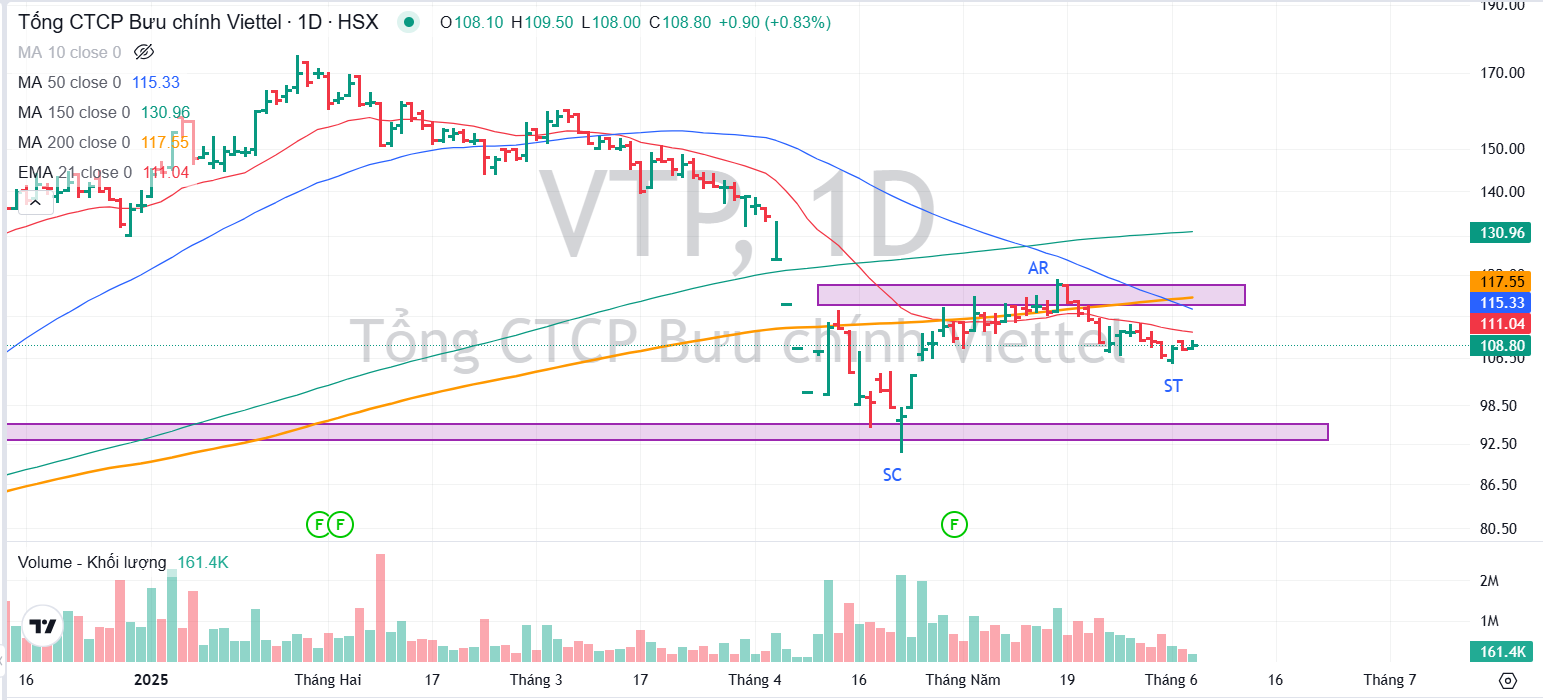 Trên đồ thị, VTP đang tích luỹ trong biên độ hẹp, quanh MA50 ngày. Sẽ cần thêm nhiều thời gian nữa, để cố phiếu tích luỹ xong nền giá.