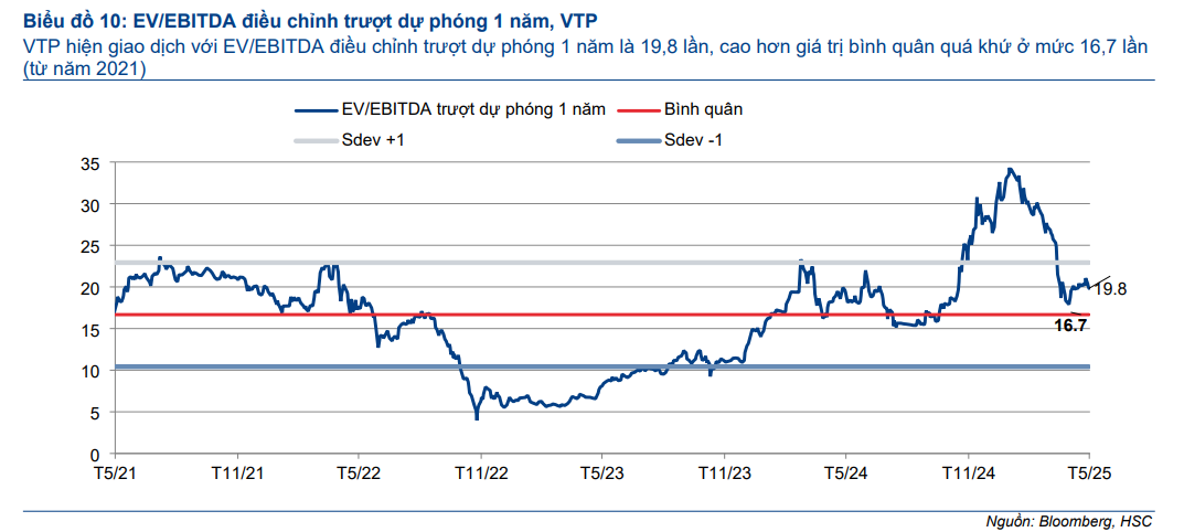Sau khi giá cổ phiếu VTP giảm 25% trong ba tháng qua, cổ phiếu đang giao dịch với EV/EBITDA điều chỉnh trượt dự phóng 1 năm là 19.8 lần, cao hơn bình quân quá khứ ở mức 16.7 lần. Tuy nhiên, HSC tin rằng VTP xứng đáng được định giá lại ở mặt bằng cao hơn nhờ quá trình chuyển đổi doanh nghiệp liên tục của công ty.