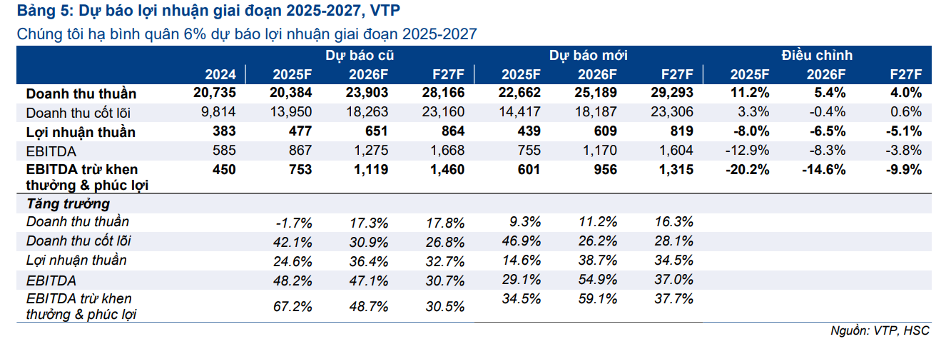 Sau kết quả kinh doanh quý 1 có phần kém tích cực, HSC đã điều chỉnh giảm bình quân 5% dự báo lợi nhuận thuần giai đoạn 2025-2027 cho VTP. Sự điều chỉnh này phản ánh tỷ suất lợi nhuận thấp hơn trong Quý 1 năm 2025 cùng với áp lực gia tăng từ chi phí khen thưởng và phúc lợi trong các năm tới.