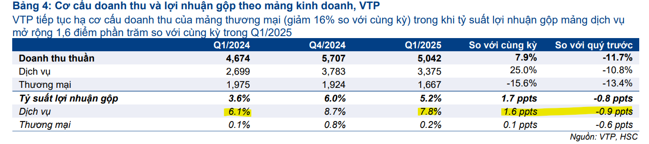 Trong Quý 1 năm 2025, VTP đã ghi nhận EBITDA và lợi nhuận thuần tăng trưởng lần lượt 54% và 19% so với cùng kỳ, nhờ doanh thu tăng vững chắc 8% so với cùng kỳ, đạt 5,042 tỷ đồng. Doanh thu vượt nhẹ dự báo của HSC, trong khi lợi nhuận thuần thấp hơn một chút.