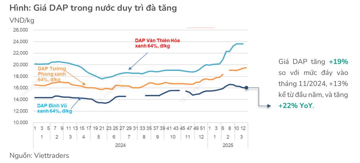 - Phân bón DAP/MAP: Giá DAP phục hồi mạnh từ vùng đáy cuối năm 2024, tăng 19% so với mức đáy tháng 11/2024 và 22% so với cùng kỳ. Đà tăng giá diễn ra trong bối cảnh nhu cầu phân bón phosphate duy trì ở mức cao. Sản lượng tiêu thụ của DGC tiếp tục tăng, hỗ trợ tăng trưởng doanh thu phân bón và tối ưu công suất WPA. HSC cũng điều chỉnh tăng giả định biên lợi nhuận gộp từ phân bón.