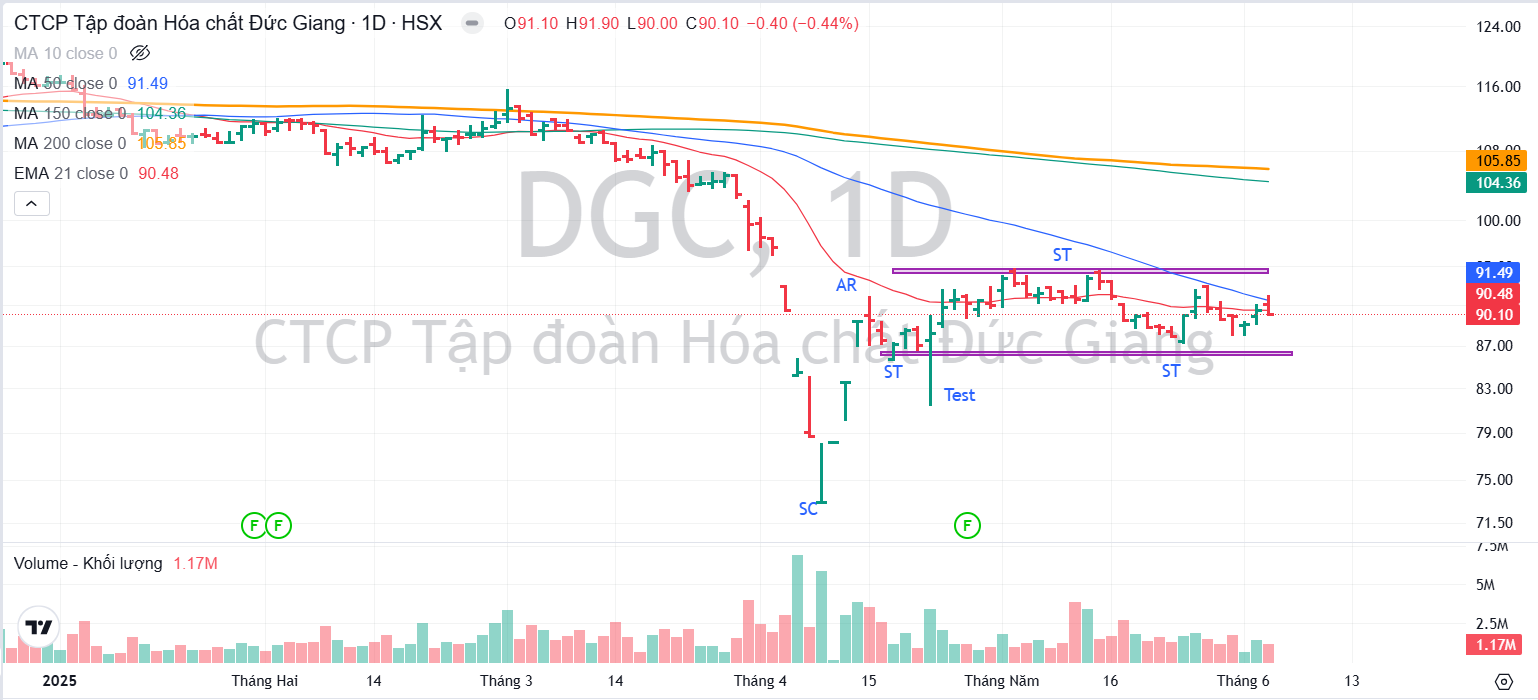 Trên đồ thị, DGC vẫn đang tích luỹ trong biên độ giá quanh MA50 ngày.