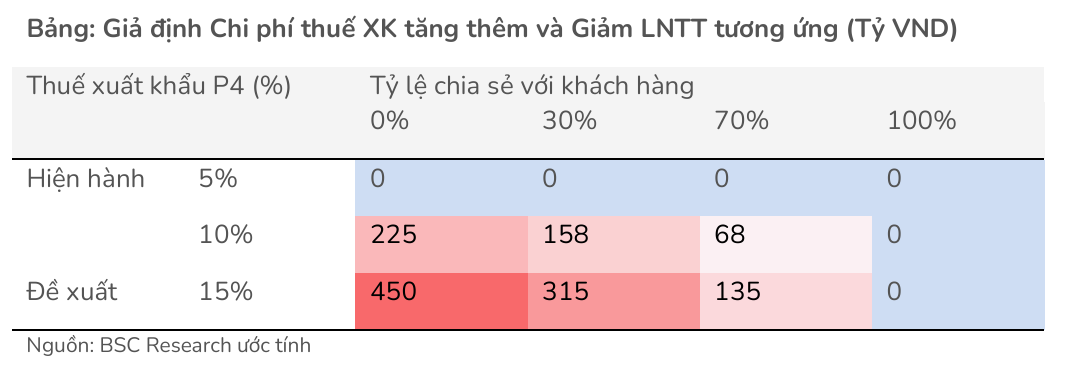 - Rủi ro chính sách thuế xuất khẩu P4: Bộ Tài chính đang lấy ý kiến dự thảo sửa đổi Nghị định 26/2023/NĐ-CP, đề xuất nâng thuế xuất khẩu phốt pho vàng từ 5% lên 15%. Nếu được thông qua, biên lợi nhuận của DGC có thể chịu ảnh hưởng trong ngắn hạn, dù công ty có thể chia sẻ một phần chi phí với khách hàng. BSC và HSC sẽ tiếp tục theo dõi sát quá trình hoàn thiện chính sách này.