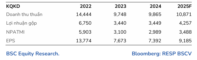 - BSC dự báo DTT và LNST-CĐTS năm 2025 đạt 10,871 tỷ VND (+10% so với cùng kỳ) và 3,488 tỷ VND (+17% so với cùng kỳ), tương ứng EPS = 9,185 VND/cp.