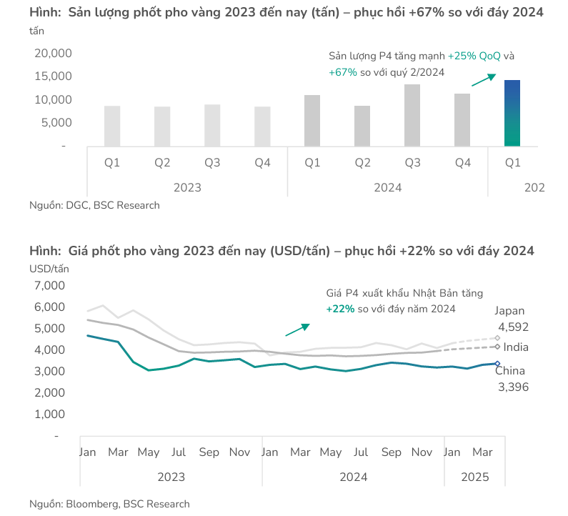 - Phốt pho vàng (P4): Sản lượng tiếp tục duy trì đà phục hồi mạnh mẽ kể từ đáy Quý 2/2024. Trong Quý 1/2025, sản lượng tăng 25% so với quý trước và 67% so với Quý 2/2024, phản ánh nhu cầu cải thiện từ các thị trường xuất khẩu chủ lực. Giá bán P4 tại Trung Quốc phục hồi nhẹ quanh 4,200 USD/tấn. Cả hai công ty chứng khoán đều nhận định sản lượng sẽ là động lực tăng trưởng chính, trong khi giá bán cải thiện trong biên độ hẹp.