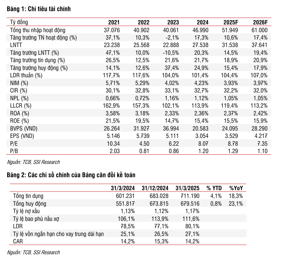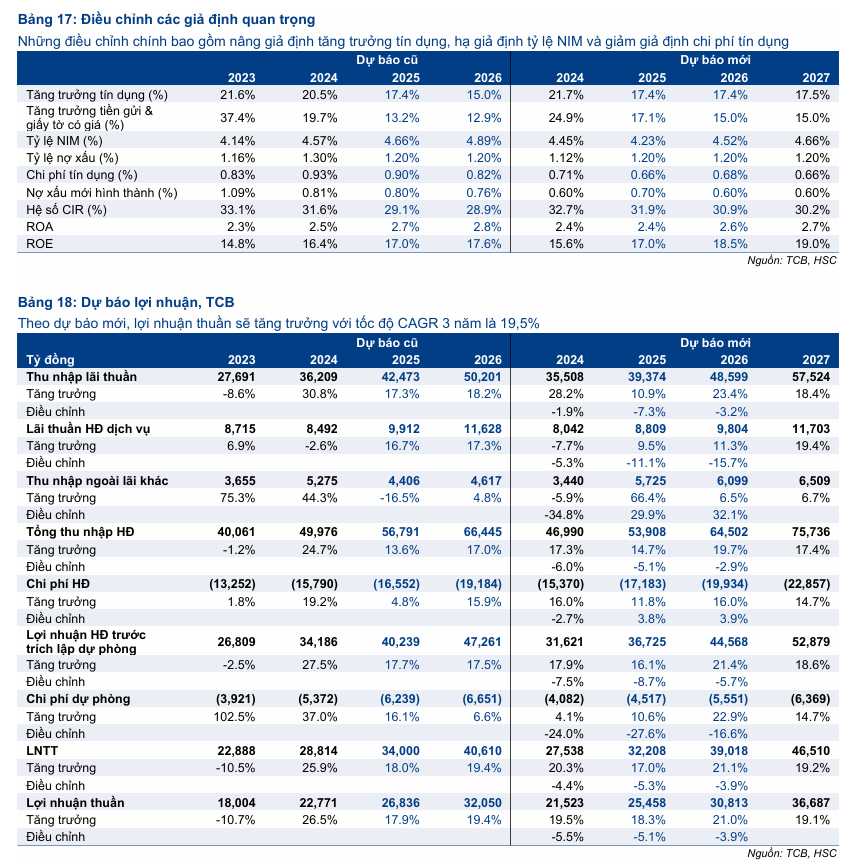 - BSC (20.5.2025): Khuyến nghị NẮM GIỮ với giá mục tiêu cập nhật là 33,100 đồng/cp . BSC cho rằng TCB có vị thế thuận lợi để cải thiện NIM khi thị trường BĐS phục hồi và định giá hiện tại (P/B 1 năm = 1.3x) chưa hoàn toàn tương xứng với triển vọng. BSC điều chỉnh giảm nhẹ lần lượt 2.5% và 4.2% đối với dự báo LNTT 2025F và 2026F của TCB xuống 31,800 nghìn tỷ (+16% YoY) và 38,200 tỷ (+20% YoY)