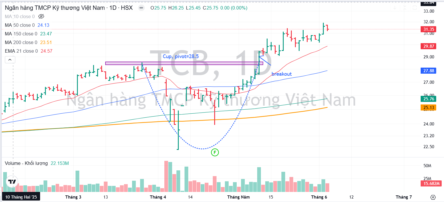 Trên đồ thị, TCB đã breakout Chiếc Cốc vào ngày 12.5.2025 và đang neo giữ ở vùng đỉnh cao nhất mọi thời đại.