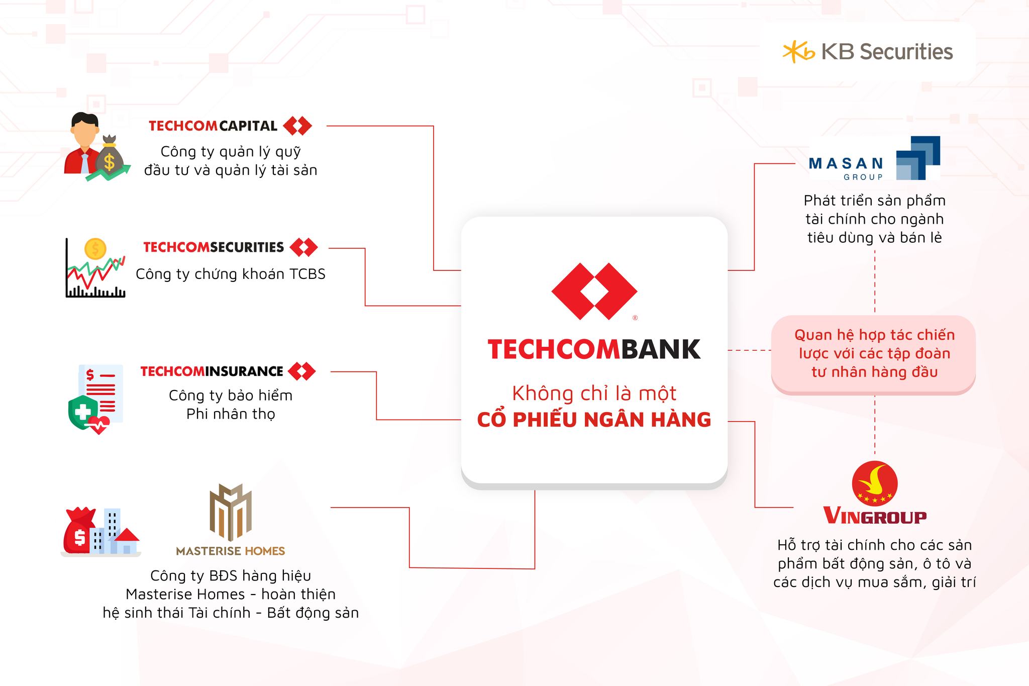 - TCB đã bắt đầu chiến lược mở rộng sang cả lĩnh vực bảo hiểm nhân thọ (Techcombank Life – TCLife) và phi nhân thọ (TCGIns) nhằm đa dạng hóa nguồn doanh thu và mở rộng dịch vụ.