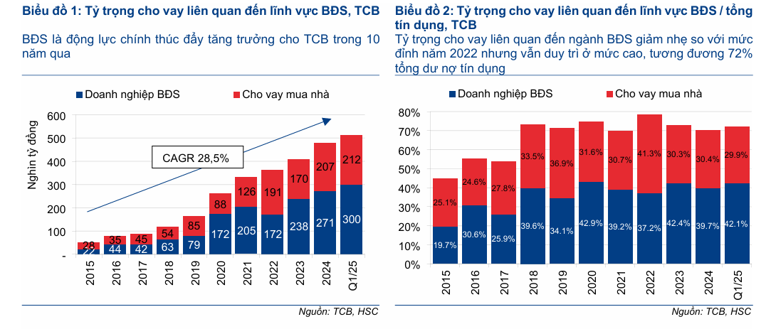 - TCB có tỷ trọng tín dụng liên quan đến bất động sản cao nhất trong số các ngân hàng phân tích (khoảng 72%). Sự phục hồi của thị trường bất động sản kể từ nửa cuối năm 2024, cùng với nỗ lực tháo gỡ nút thắt pháp lý của Chính phủ, sẽ củng cố triển vọng rủi ro được cải thiện và thúc đẩy tăng trưởng lợi nhuận cốt lõi của TCB.