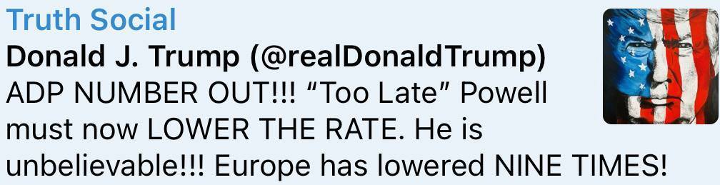 “SỐ LIỆU ADP ĐÃ CÔNG BỐ!!! Powell “Quá Trễ” giờ phải HẠ LÃI SUẤT. Ông ấy thật không thể tin được!!! Châu Âu đã hạ CHÍN LẦN!” Trump viết, ám chỉ số liệu bảng lương khu vực tư nhân do Automatic Data Processing, một công ty của Mỹ cung cấp.