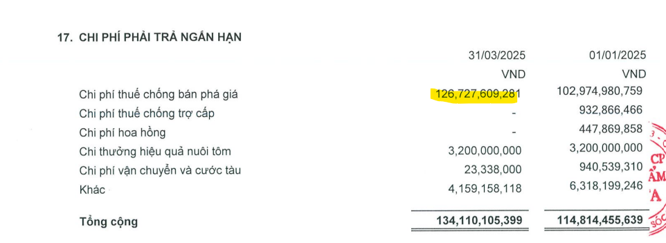 KQKD Quý 1/2025: Doanh thu tăng trưởng mạnh 36%, đạt 1,990 tỷ đồng, nhờ sản lượng tôm tiêu thụ đạt 6,119 tấn (+43% yoy). Tuy nhiên, LNST Công ty mẹ chỉ đạt 29.6 tỷ đồng (-40% yoy) do chi phí bán hàng tăng vọt 194% (đạt 88 tỷ đồng) và công ty phải ghi nhận chi phí thuế chống bán phá giá và chống trợ cấp mà năm ngoái không có.