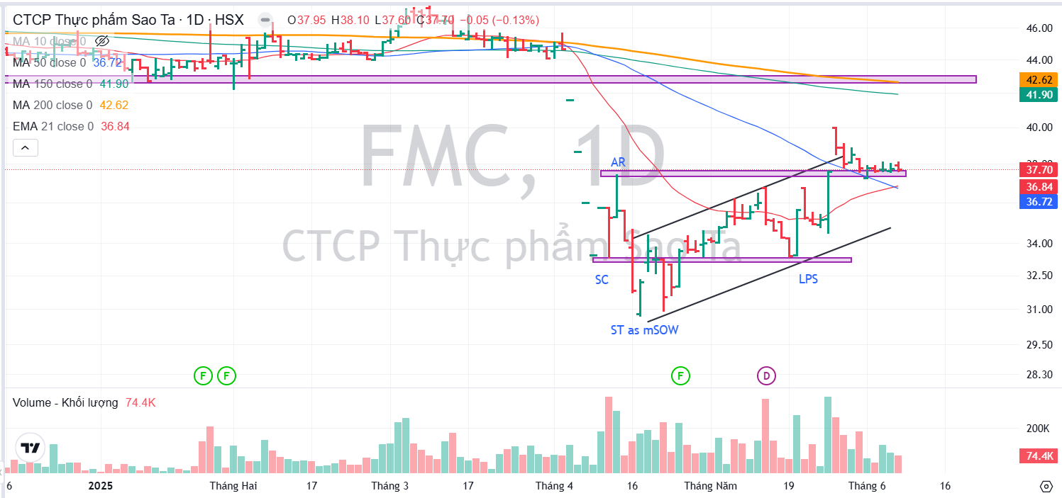 Trên đồ thị, RS của FMC là 24, nằm trong số các cổ phiếu hoạt động kém trên thị trường. Do đó, Elibook Team không khuyến nghị đầu tư vào FMC tại thời điểm hiện tại. Cổ phiếu FMC đang cố gắng tích luỹ quanh MA50 ngày và điều này cần thêm thời gian để biết dòng tiền lớn tham gia hay không.