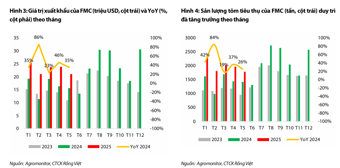 Tiếp đà tăng trưởng Quý 2: Hai tháng đầu Quý 2/2025, giá trị xuất khẩu của FMC (tôm + nông sản) tiếp tục tăng 41%yoy, đạt 44.83 triệu USD, nhờ sản lượng tôm tiêu thụ đạt 3,700 tấn (+31% yoy). Lũy kế 5 tháng đầu năm 2025, FMC ghi nhận doanh thu xuất khẩu đạt 115 triệu USD (+41% yoy) so với mức tăng trưởng 28.3% của toàn ngành tôm (thẻ, sú, hùm và khác). Điều này cho thấy FMC vẫn có lợi thế cạnh tranh nhất định trên thị trường quốc tế.