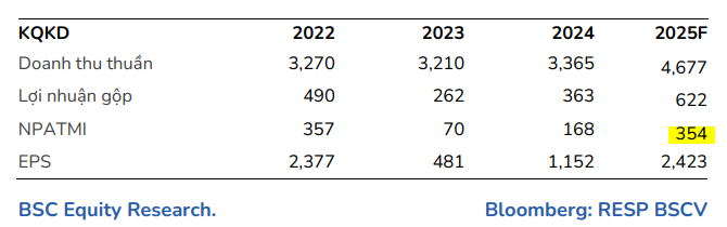 Dựa trên kết quả tích cực này, BSC đã điều chỉnh tăng dự báo DTT và LNST-CĐTS năm 2025 của DDV lên lần lượt 4,677 tỷ VND (+39% yoy) và 354 tỷ VND (+110% yoy). EPS dự kiến đạt 2,423 VND/cp, tương ứng P/E forward 2025F là 9.8x và EV/EBITDA là 5.7x.