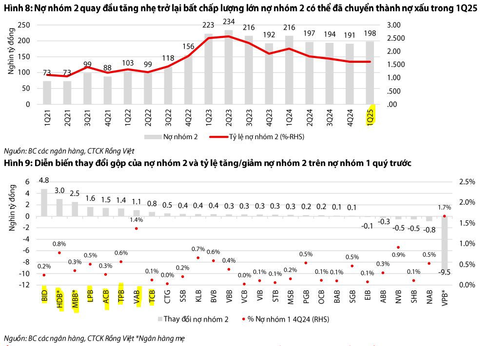 • Nợ nhóm 2 tăng trở lại: Tổng nợ nhóm 2 của các ngân hàng đã tăng 16% so với Quý trước (QoQ) và 40% so với cùng kỳ năm trước (YoY) trong Quý 1/2025, đạt 162 nghìn tỷ đồng. Tỷ lệ nợ nhóm 2 trên tổng dư nợ đã tăng lên 1.92%, so với mức 1.6% trong Quý 4/2024.