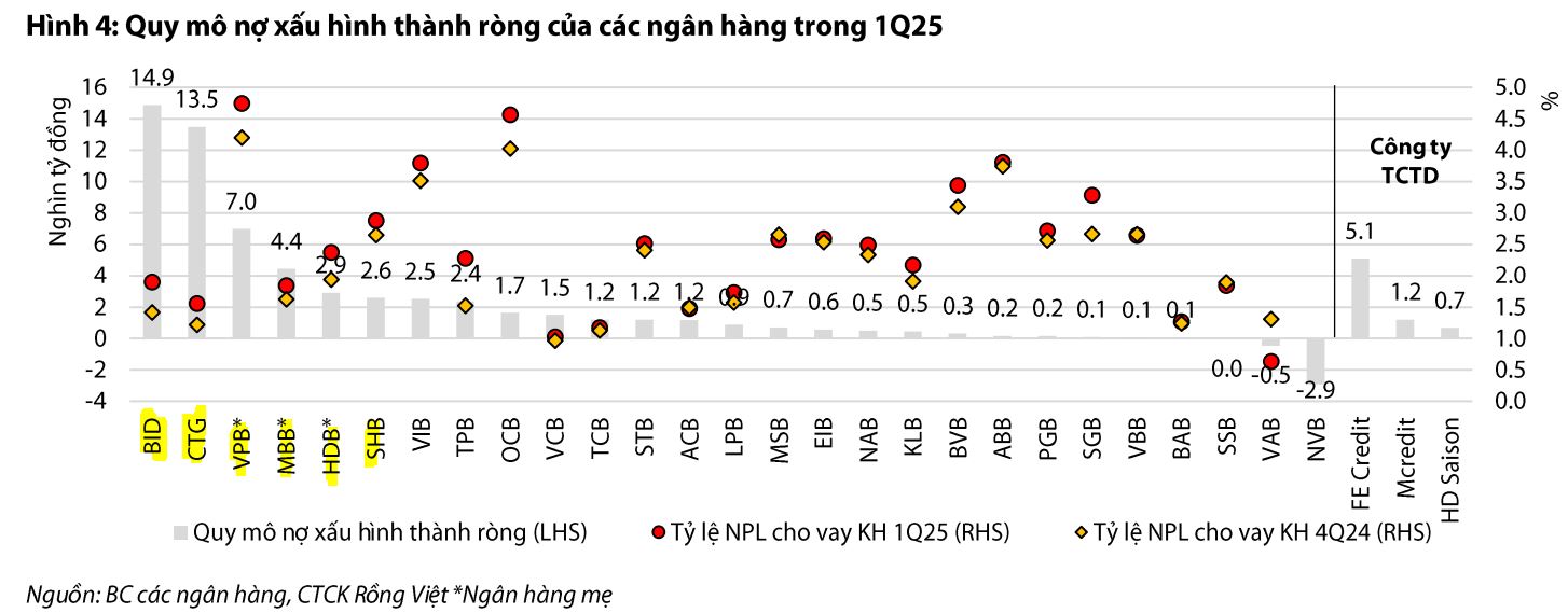 • Chất lượng tín dụng suy giảm ở một số ngân hàng: Tỷ lệ nợ xấu hợp nhất toàn ngành có sự phân hóa. Mặc dù tỷ lệ nợ xấu ở một số ngân hàng giảm nhẹ nhờ đẩy mạnh xử lý nợ xấu, nhưng áp lực nợ quá hạn và nợ hình thành mới vẫn còn lớn ở các ngân hàng như CTG, VPB, MBB, OCB, SHB, TCB, VIB.