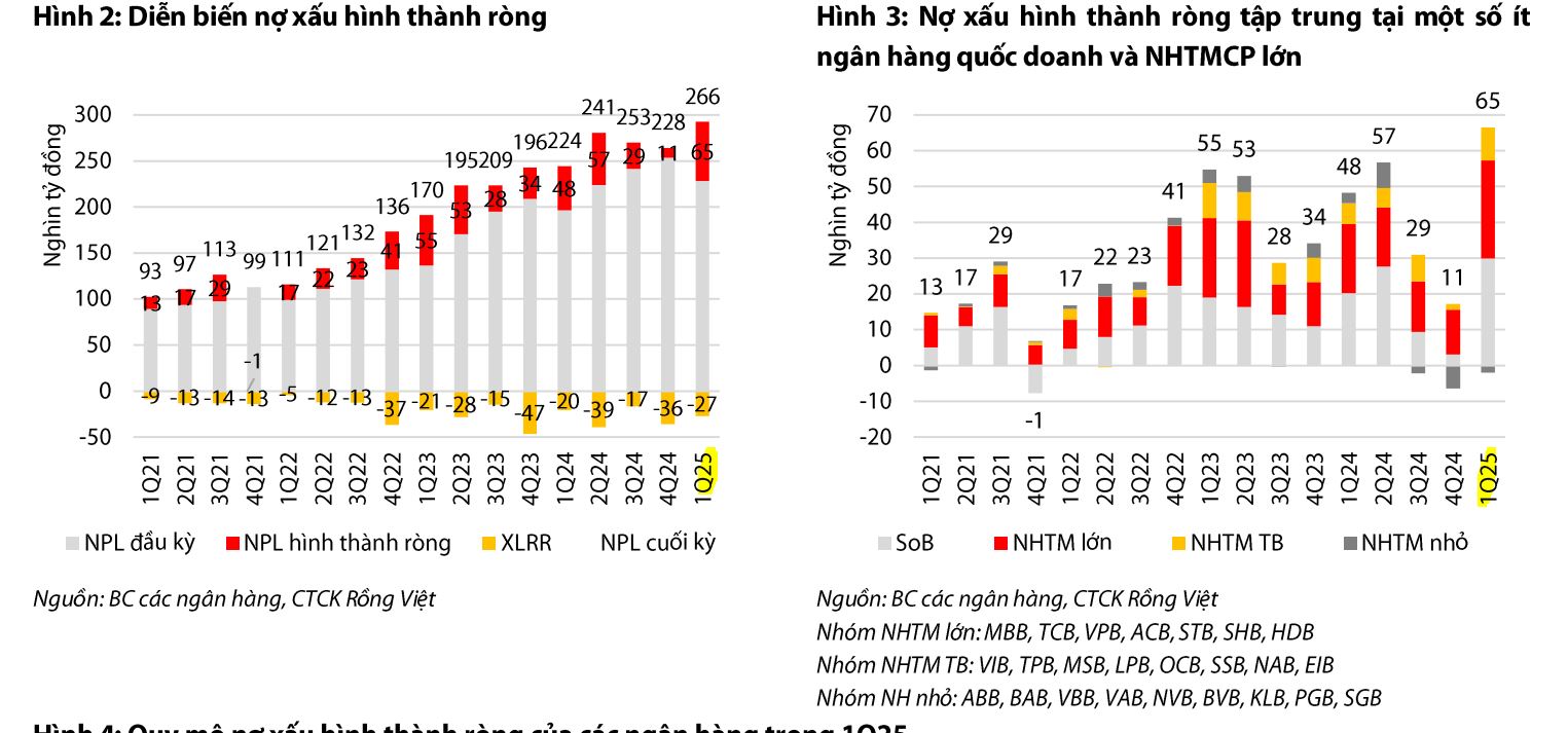 • Nợ hình thành mới tăng vọt: Nợ hình thành mới (nợ mới phát sinh và chuyển nhóm) tiếp tục ở mức cao, đạt 64,500 tỷ đồng trong Quý 1/2025, tăng 11% so với Quý trước. Đặc biệt, nợ hình thành mới tập trung chủ yếu ở nhóm Khách hàng doanh nghiệp lớn (CTG, VPB, MBB) và Khách hàng cá nhân (MSB, VPBank, VCB, SCB), với mức tăng lần lượt là 57,50 tỷ và 69%.