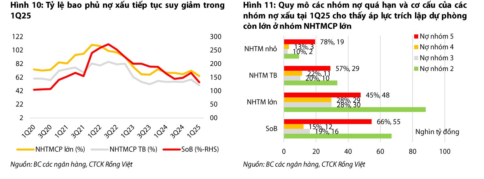 • Áp lực trích lập dự phòng cao: Tỷ lệ bao phủ nợ xấu (LLR) của toàn ngành đạt 92% trong Quý 1/2025, giảm so với mức 110% của Quý trước. Điều này cho thấy các ngân hàng đang phải đối mặt với áp lực lớn trong việc trích lập dự phòng để đối phó với nợ xấu gia tăng.