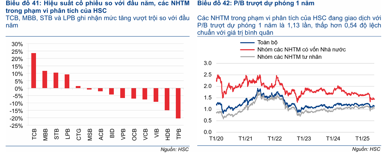 Giá cổ phiếu ngành ngân hàng đã giảm 1.2% kể từ đầu năm, kém tích cực hơn VN-Index. Tuy nhiên, sau đợt điều chỉnh mạnh do thông báo của ông Trump về chính sách thuế đối ứng, cổ phiếu ngành ngân hàng đã phục hồi 14.5% từ ngày 9/4 đến 30/5/2025. Hiện ngành đang giao dịch với P/B trượt dự phóng 1 năm là 1.13 lần, thấp hơn 0.54 độ lệch chuẩn so với bình quân quá khứ, tiềm năng tăng giá bình quân 20%.