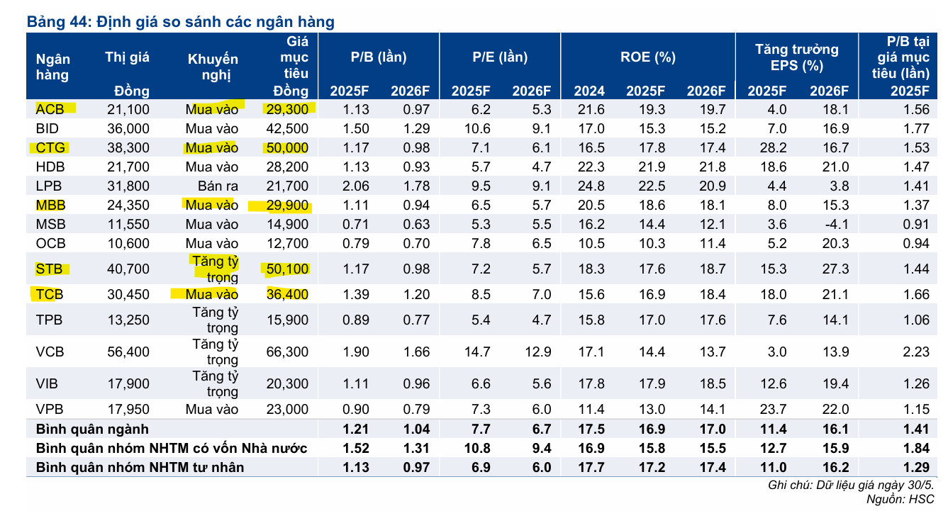Những lựa chọn cổ phiếu hàng đầu của HSC bao gồm: ACB, CTG, MBB, STB và TCB. HSC cũng ưa thích HDB và VPB cho nhà đầu tư có khẩu vị rủi ro cao hơn, và ACB cho nhà đầu tư dài hạn với tính phòng thủ cao.
