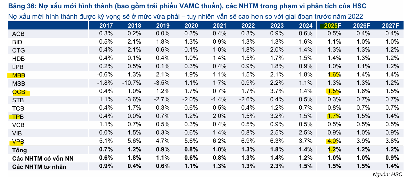 Mặc dù chất lượng tài sản chưa cải thiện rõ rệt, động thái luật hóa Nghị quyết 42/2017 về xử lý nợ xấu được kỳ vọng sẽ tác động tích cực đến hoạt động thu hồi nợ trong thời gian tới. HSC dự báo tăng trưởng tín dụng sẽ tăng tốc từ Quý 2/2025 và duy trì đà tăng trưởng vững chắc trong năm 2026-2027, với mặt bằng lãi suất cho vay thấp để hỗ trợ nền kinh tế.