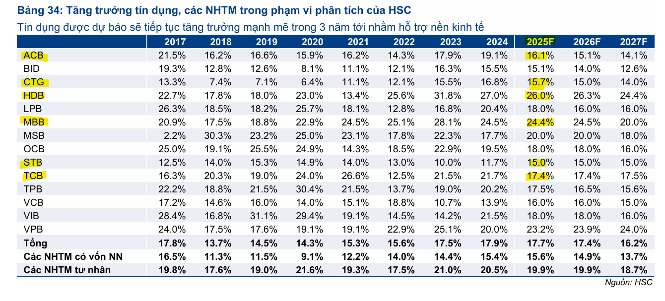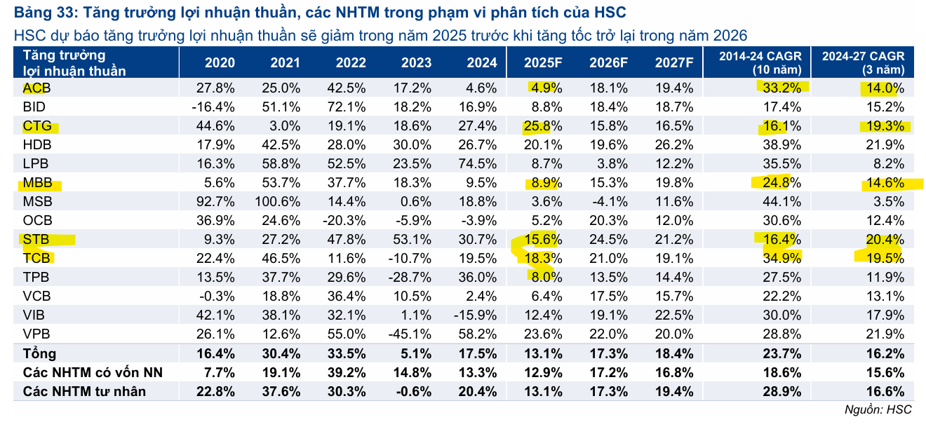 Do triển vọng tỷ lệ NIM kém tích cực hơn dự kiến, HSC đã giảm bình quân 3.5% dự báo lợi nhuận thuần cho các ngân hàng trong phạm vi phân tích cho giai đoạn 2025-2026. Theo dự báo mới, lợi nhuận thuần toàn ngành dự kiến tăng trưởng 13.1% trong năm 2025, 17.3% trong năm 2026 và 18.4% trong năm 2027.