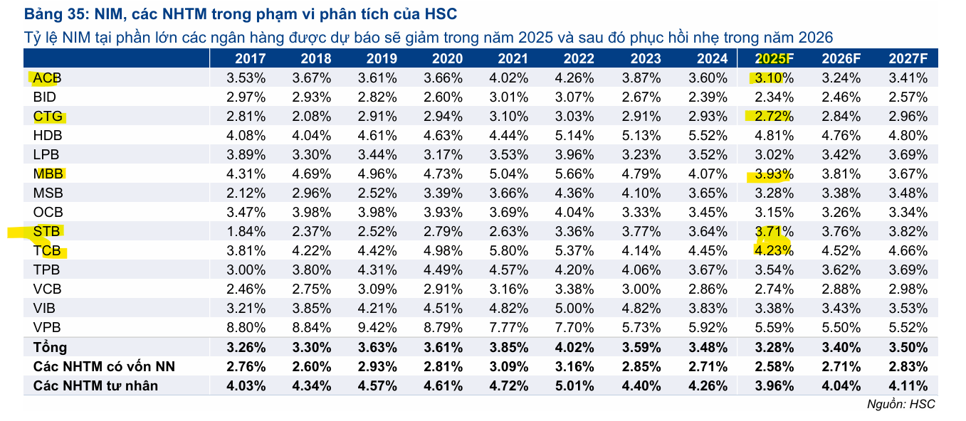 HSC dự báo tỷ lệ NIM sẽ đi ngang trong Quý 2/2025 và sau đó cải thiện nhẹ khoảng 10-20 điểm cơ bản trong nửa cuối năm, dẫn đến tỷ lệ NIM cả năm 2025 ước tính giảm nhẹ khoảng 20 điểm cơ bản. Sự cải thiện về lợi suất gộp sẽ phụ thuộc vào nhu cầu tín dụng thực tế phục hồi và cơ cấu các khoản vay chuyển dịch sang các kỳ hạn dài hơn.