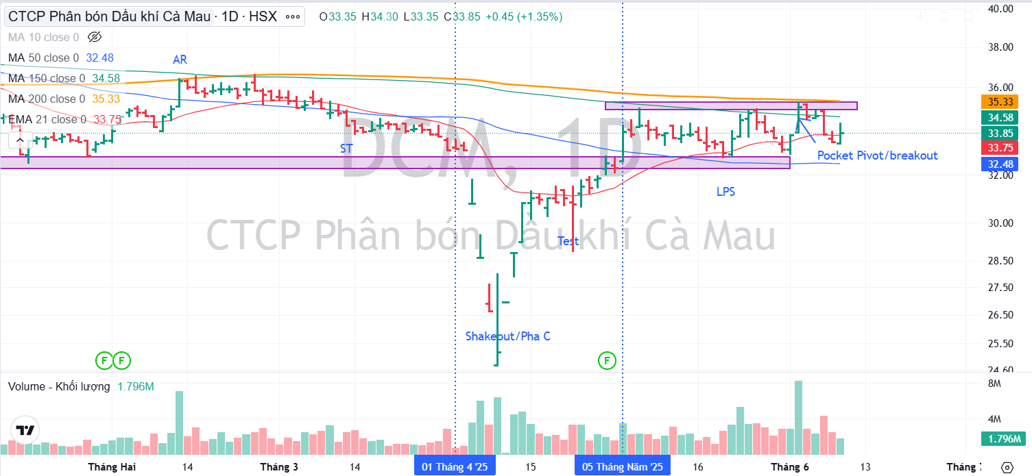 Ngày 3.6.2025, DCM có điểm mua Pocket PIvot, nhưng giá sau đó điều chỉnh giảm vì ảnh hưởng bởi sự điều chỉnh của thị trường chung.
