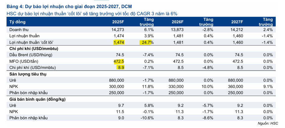 HSC duy trì dự báo lợi nhuận giai đoạn 2025-2027. Dù tăng trưởng dự kiến chậm lại trong 2026-2027, lợi nhuận thuần HĐKD cốt lõi của DCM được dự báo vẫn tăng trưởng với tốc độ CAGR 3 năm đạt mức tích cực 6%.