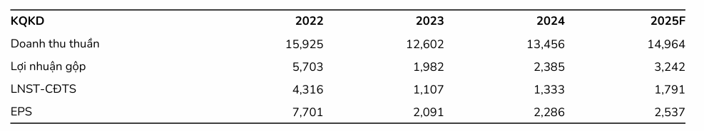 - Năm 2025: HSC dự báo lợi nhuận thuần đạt 1,474 tỷ đồng. Nếu không tính khoản lợi nhuận không thường xuyên 189 tỷ đồng trong năm 2024 (từ thương vụ KVF), lợi nhuận hoạt động kinh doanh cốt lõi (HĐKD cốt lõi) dự kiến tăng trưởng mạnh 24.7%. Tăng trưởng này được hỗ trợ bởi chính sách hoàn thuế GTGT có hiệu lực từ nửa cuối năm 2025 và giá urê trong nước duy trì ở mức cao.