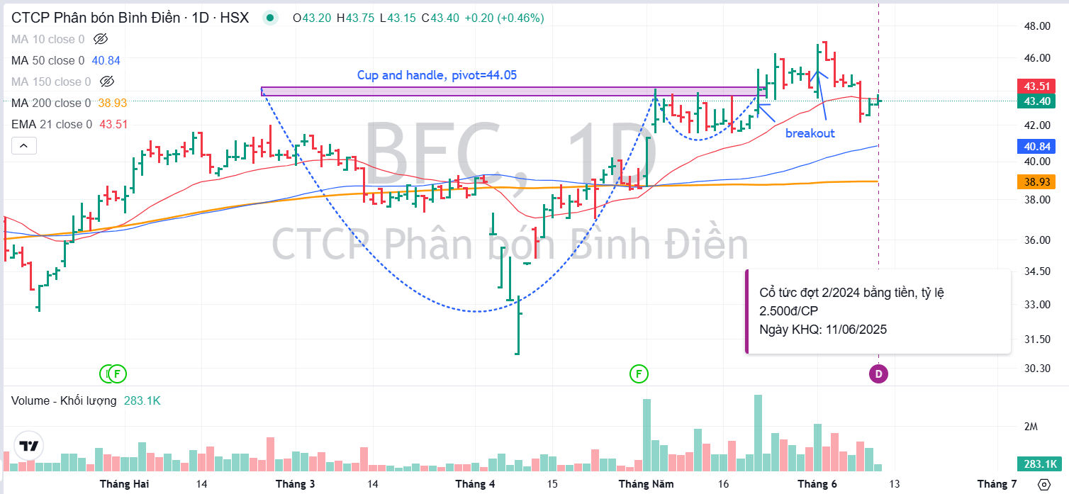 Trên đồ thị, BFC có RS=88, nằm trong số các cổ phiếu hoạt động tốt trên thị trường. Sau khi breakout mẫu hình Chiếc Cốc Tay Cầm, vượt qua điểm mua 44,000 vào ngày 22.5.2025 và 2.6.2025, BFC đang điều chỉnh về EMA 21 ngày với thanh khoản thấp để tìm hỗ trợ.