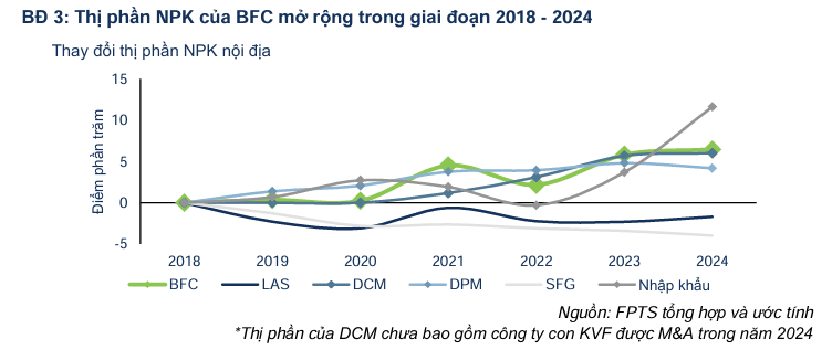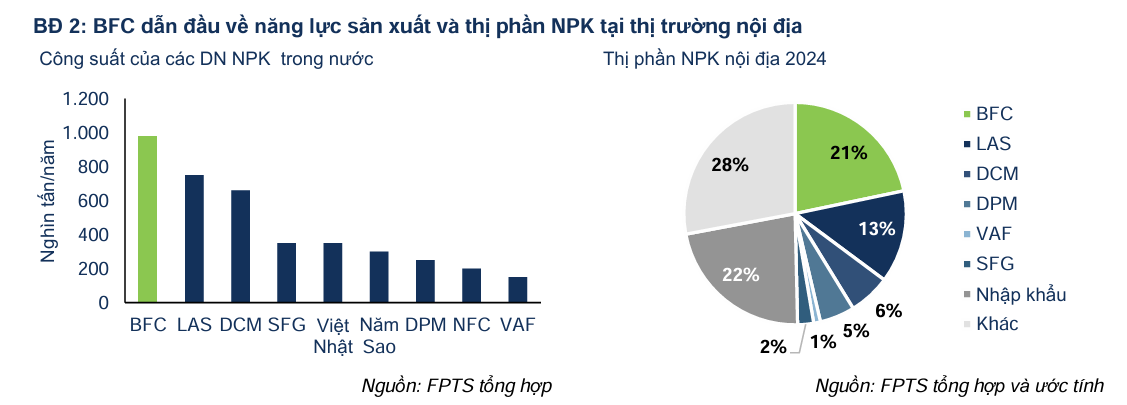 So sánh: BFC là doanh nghiệp có quy mô sản xuất NPK lớn nhất cả nước với tổng công suất 975 nghìn tấn/năm (~24% tổng công suất nội địa), chiếm 21% thị phần tiêu thụ tại thị trường nội địa, dẫn đầu ở thị trường miền Trung, Tây Nguyên và Nam Bộ. Xếp thứ hai là LAS với tổng công suất 750 nghìn tấn/năm, chiếm ~13% thị phần, dẫn đầu ở khu vực phía Bắc.