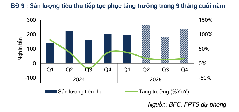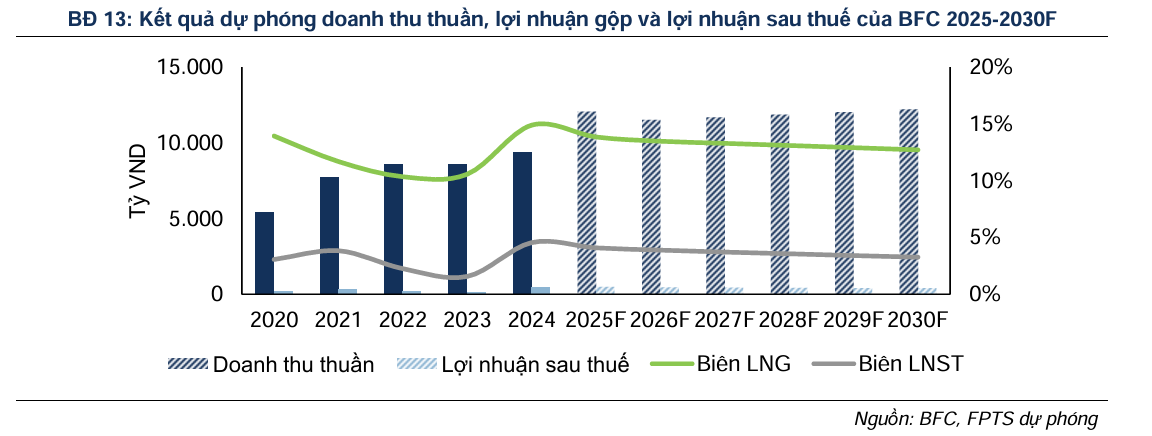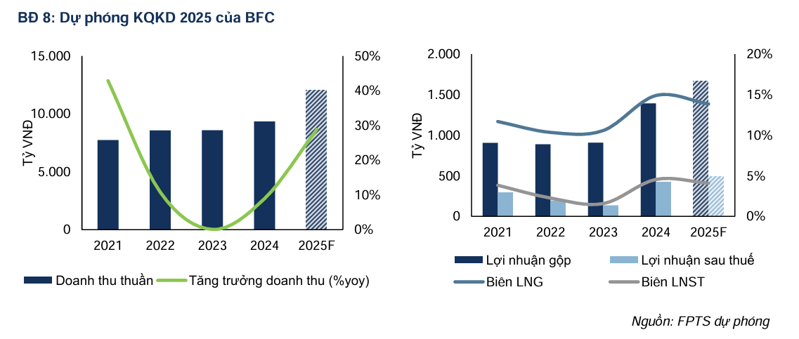 Mặc dù BFC đặt kế hoạch kinh doanh năm 2025 tương đối thận trọng (doanh thu giảm -22% và lợi nhuận trước thuế giảm -47% so với thực hiện 2024), FPTS vẫn duy trì dự báo lạc quan hơn: